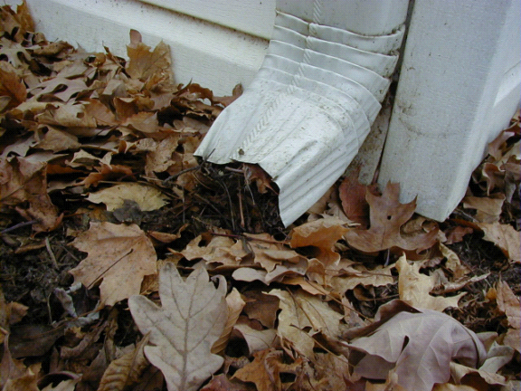 The bottom of the downspout is plugged with leaves.